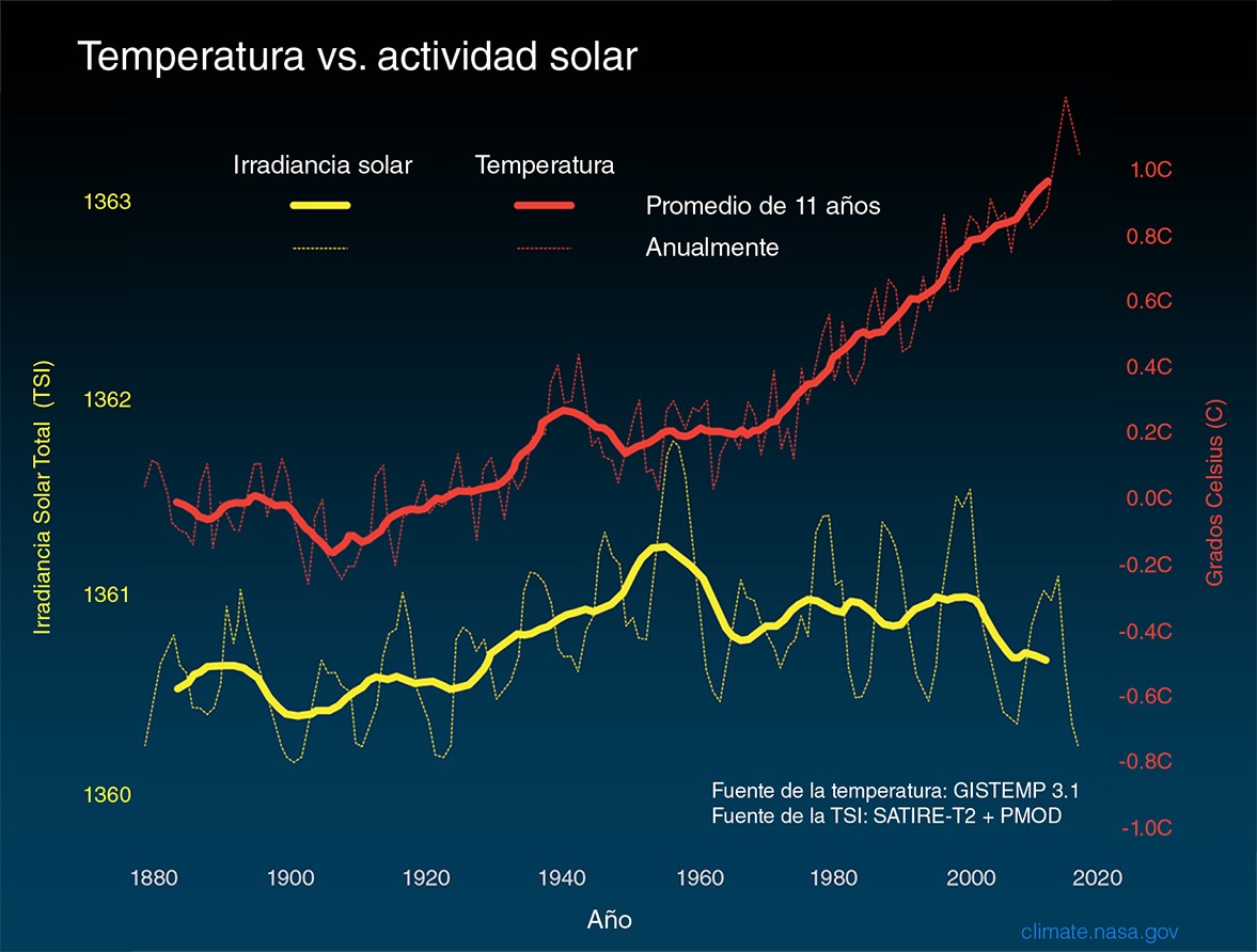 Desde 1978, se ha medido directamente la producción de energía solar. Los datos muestran una ligera disminución en la irradiancia solar (que es una medida de la cantidad de energía que emite el Sol), lo que demuestra que el Sol no sería responsable del calentamiento observado en las últimas décadas, pues solo aportaría un 10 por ciento. En la siguiente gráfica se muestra las variaciones de la temperatura global de la Tierra en contraposición con la energía del Sol que ha recibido la Tierra.