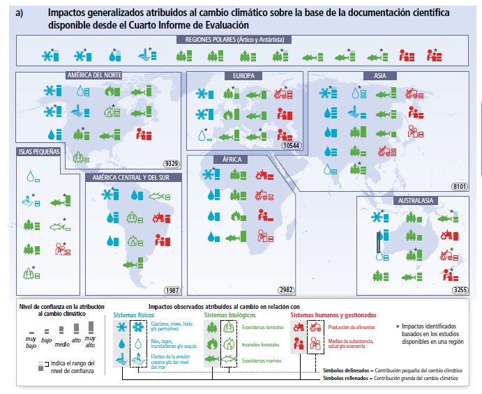 La figura siguiente muestra el cambio atribuible al cambio climático, de acuerdo con los estudios internacionales. Se indica el nivel de confianza de dicha conclusión.