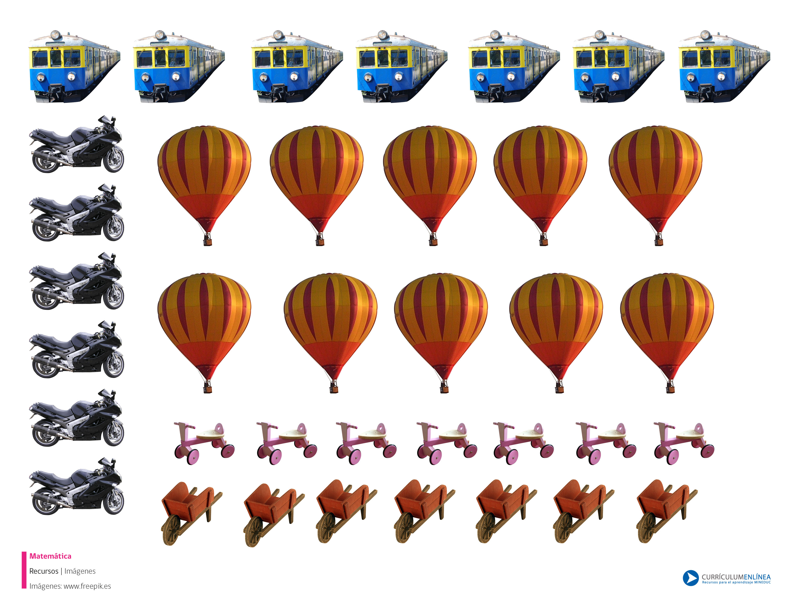 Imagen de diversos medios de transportes para recortar que puede ser utilizada con distintos fines pedagógicos, como por ejemplo para contar, escribir la cantidad de instrumentos que hay en cada grupo, realizar comparaciones, crear patrones y descubrir reglas de formación, etc.