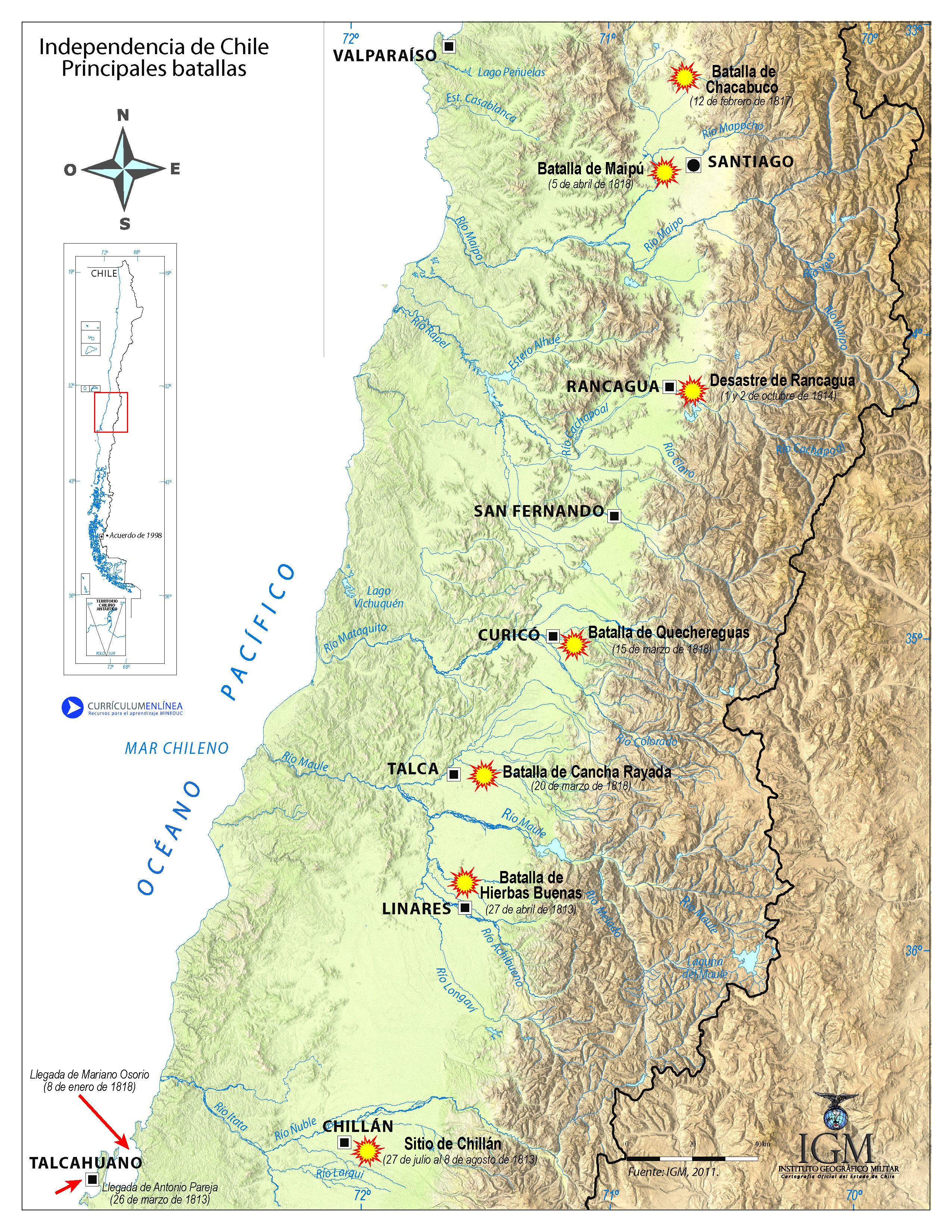 Mapa con batallas de la Independencia de Chile