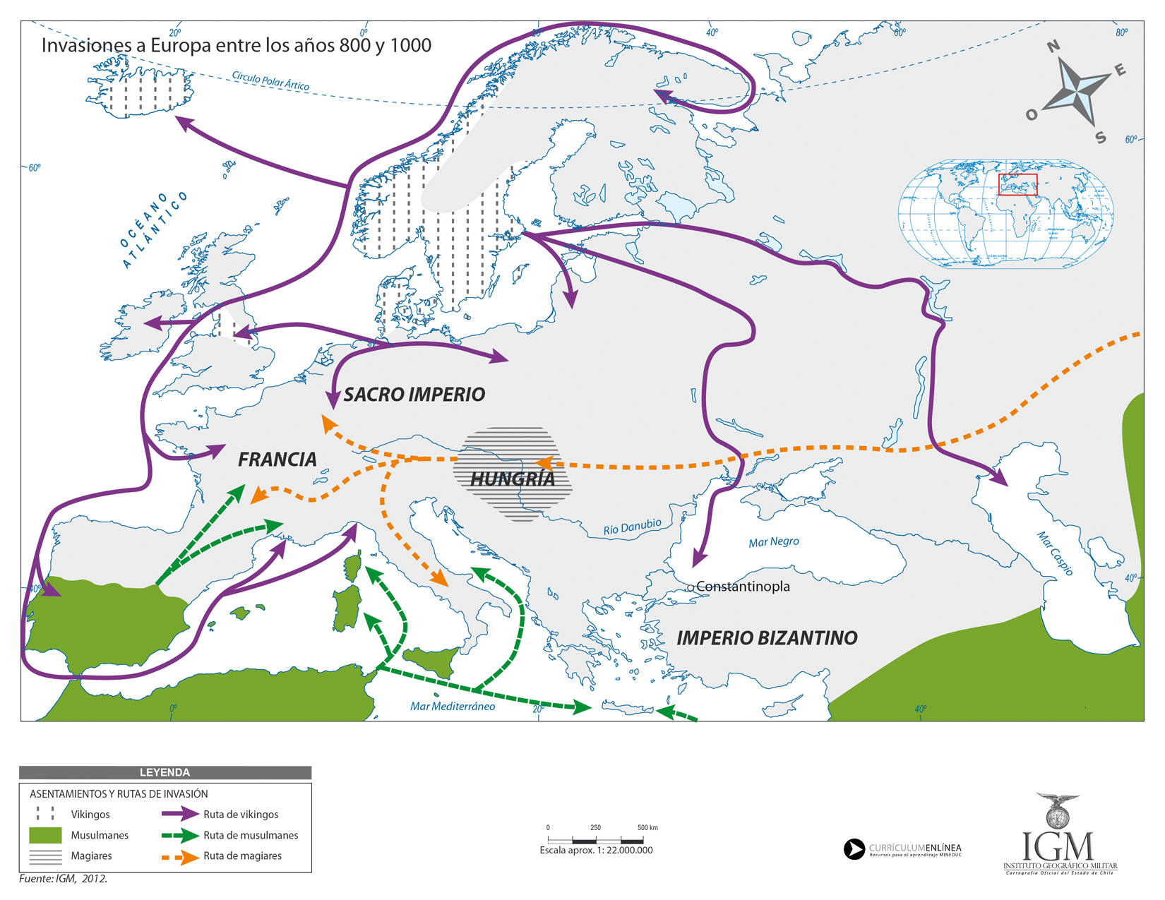 Mapa con las invasiones a Europa entre el siglo IX y y XI