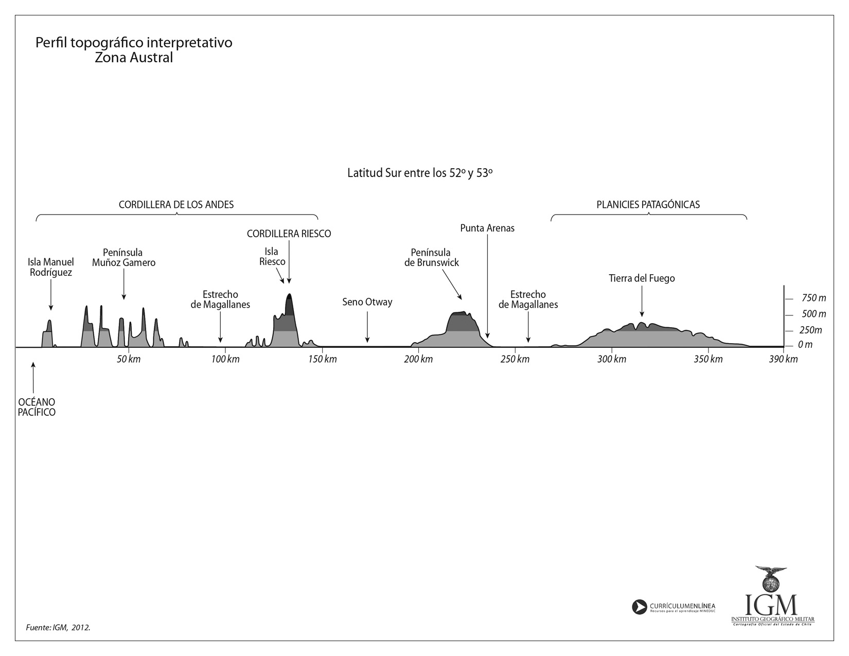 Mapa del perfil topográfico de la Zona Austral en blanco y negro