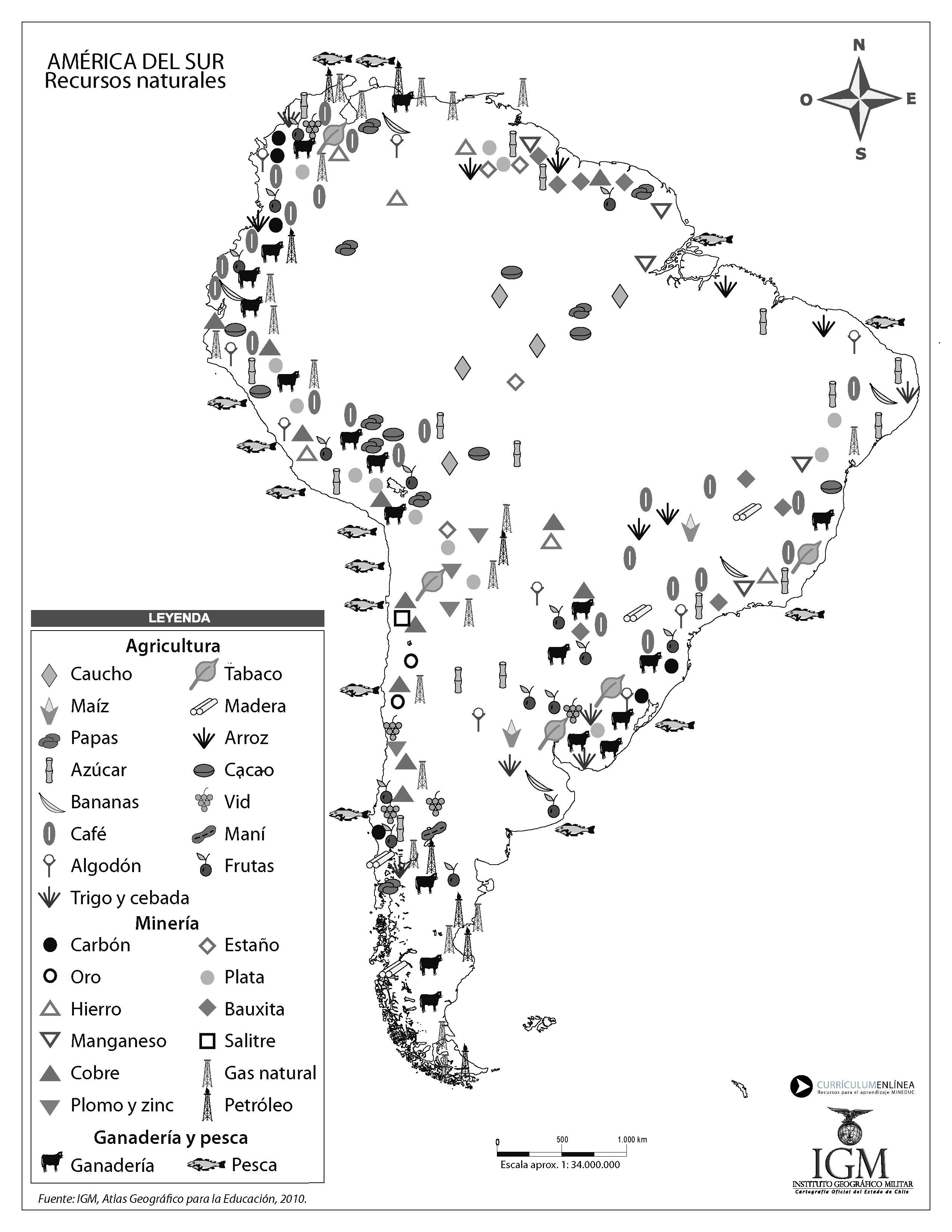 Mapa sobre los recursos naturales que se explotan en América del Sur